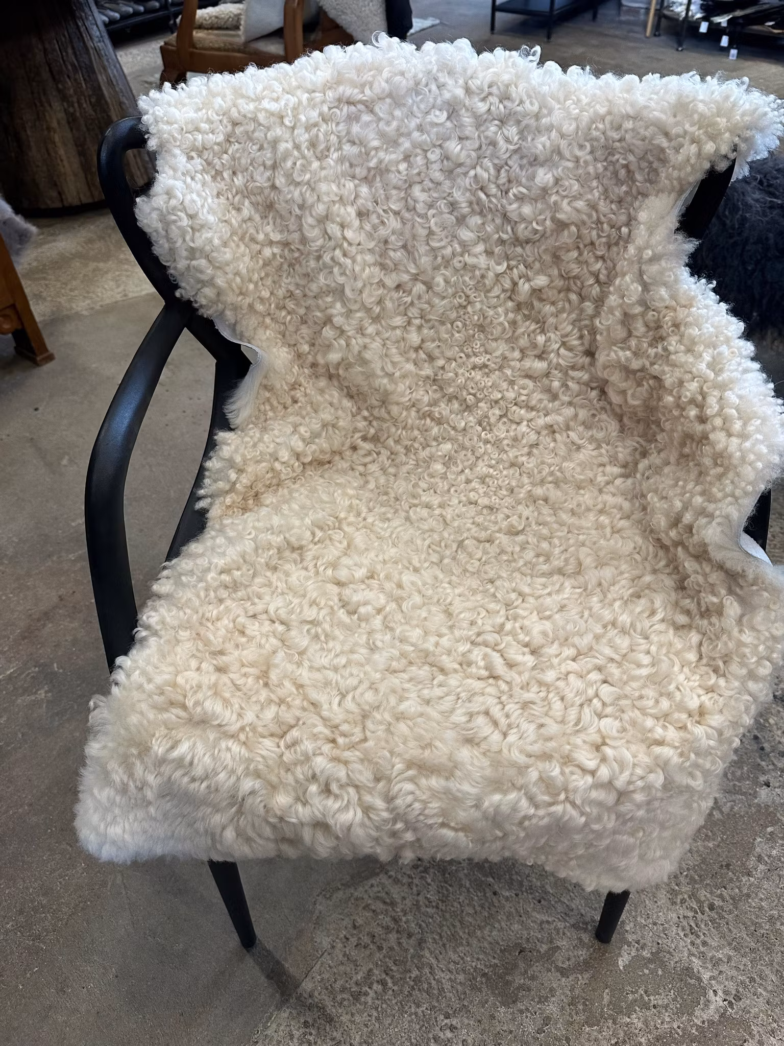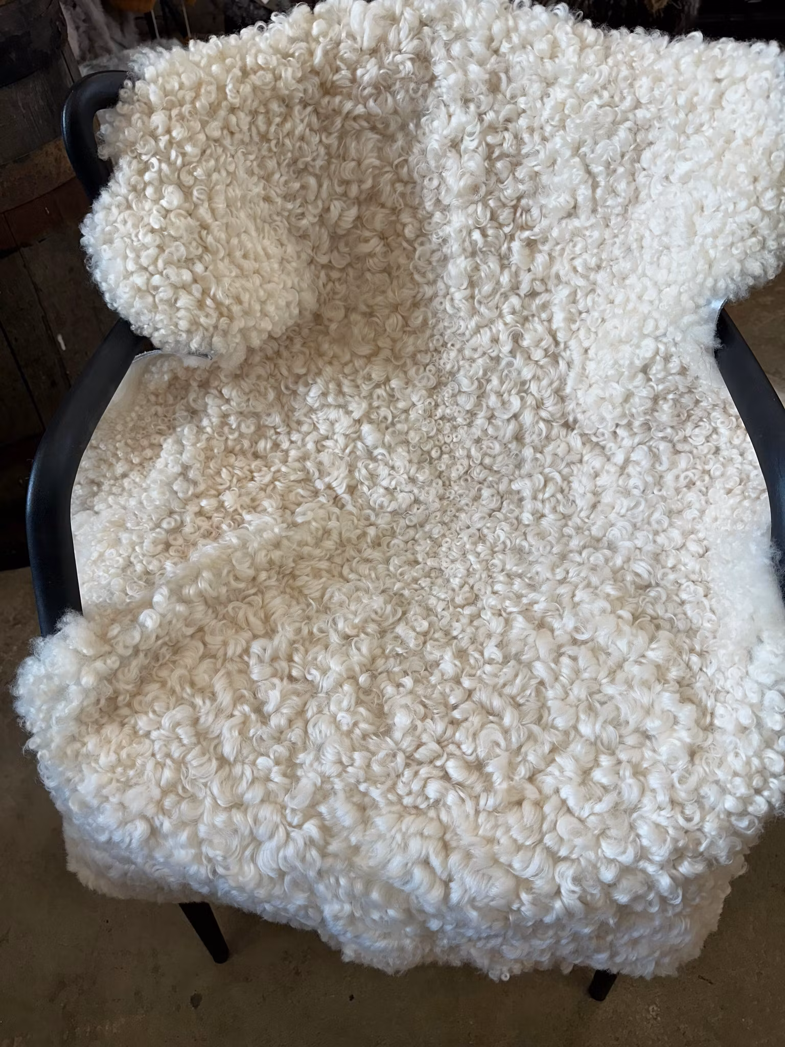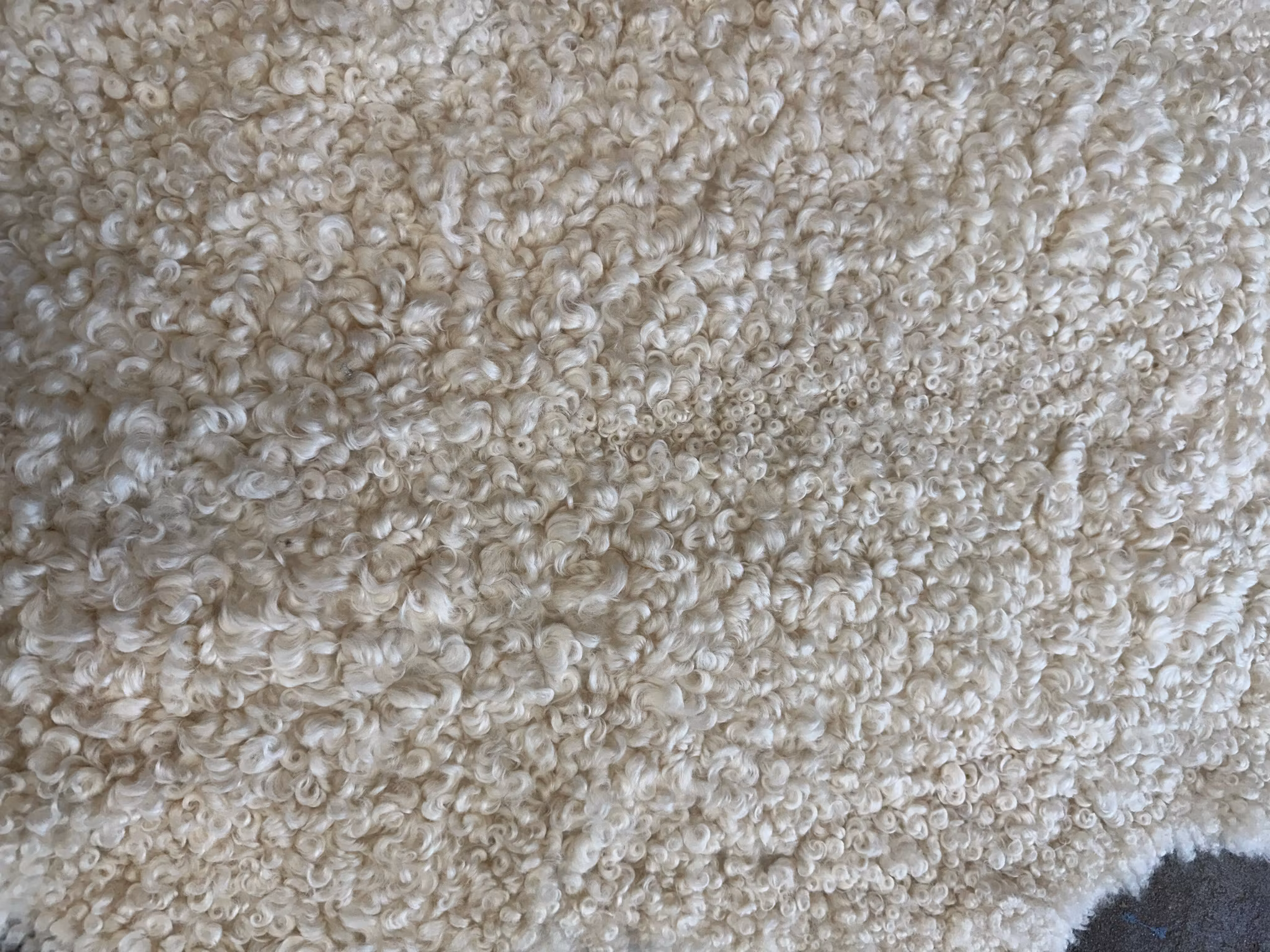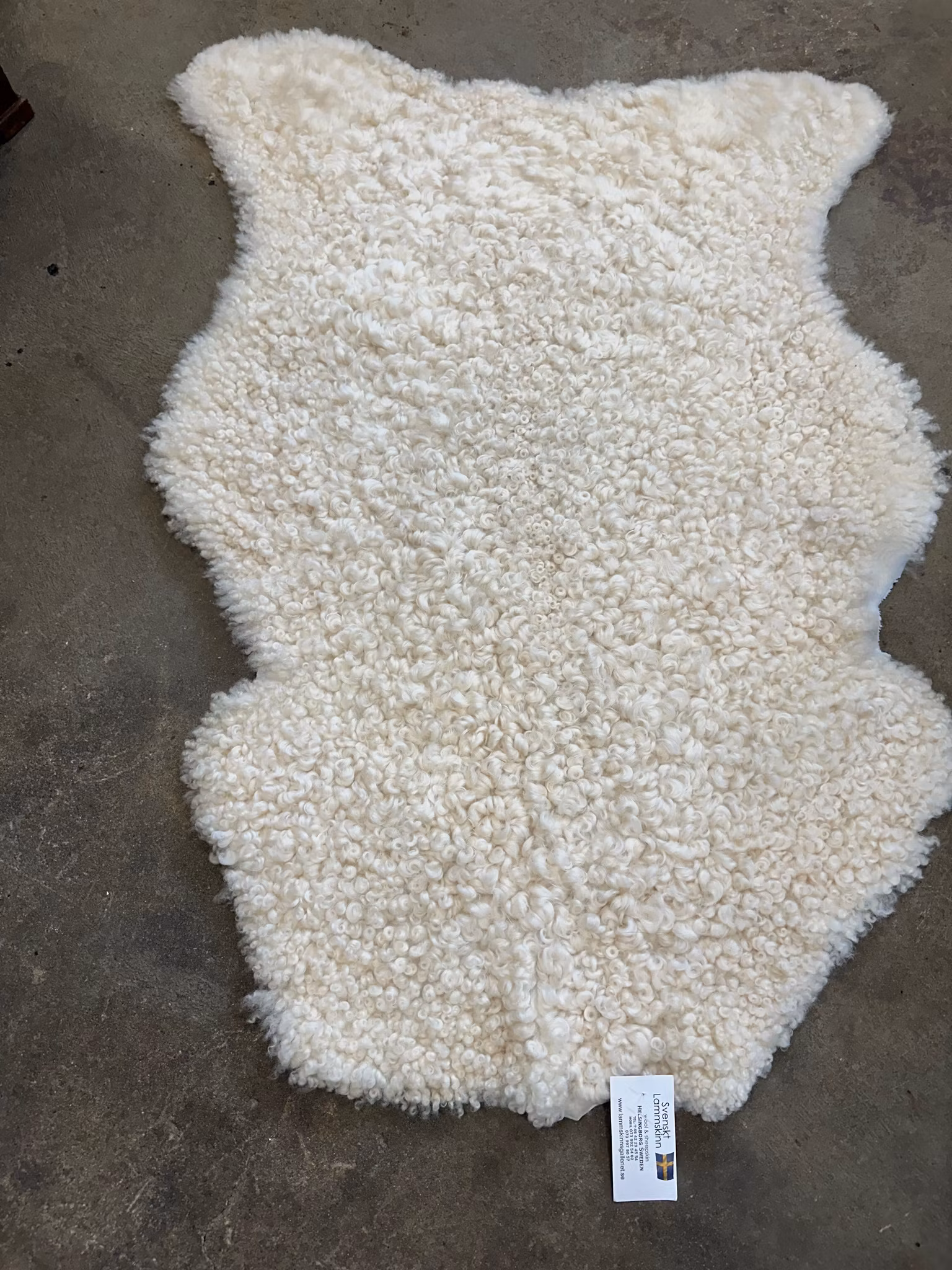 Detta fårskinn har en naturligt vit päls, alltså inte kritvit. Pälslängden är ca 5 cm.
