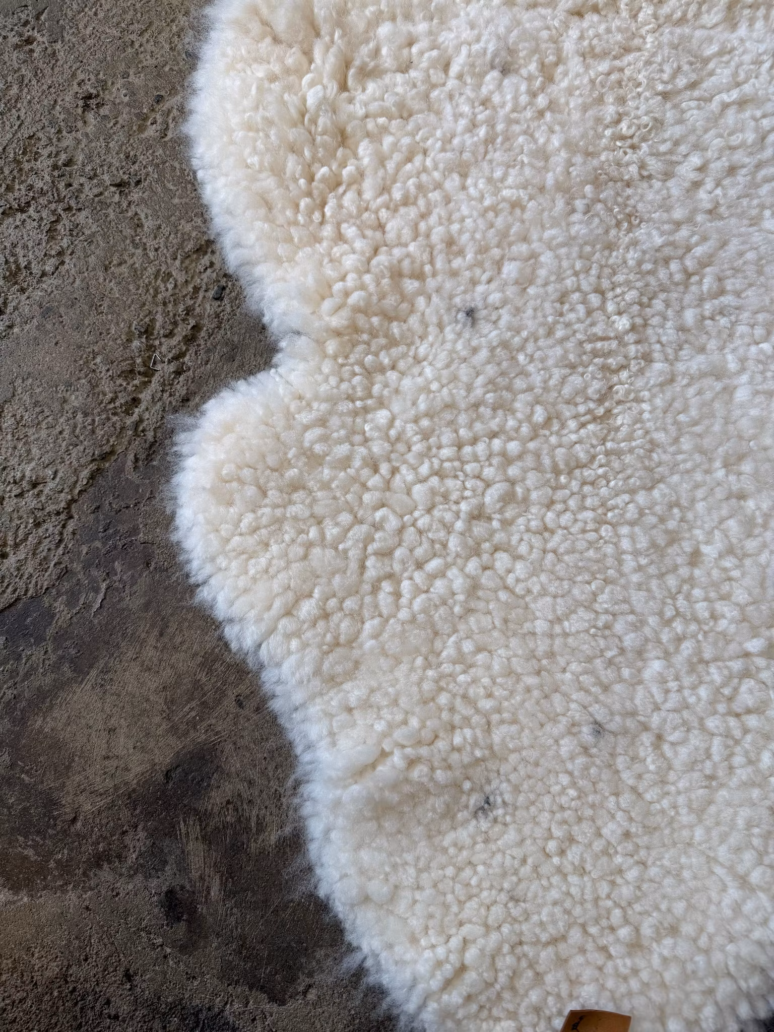 Detta fårskinn har en naturligt vit päls, alltså inte kritvit. Pälslängden är ca 5 cm.
