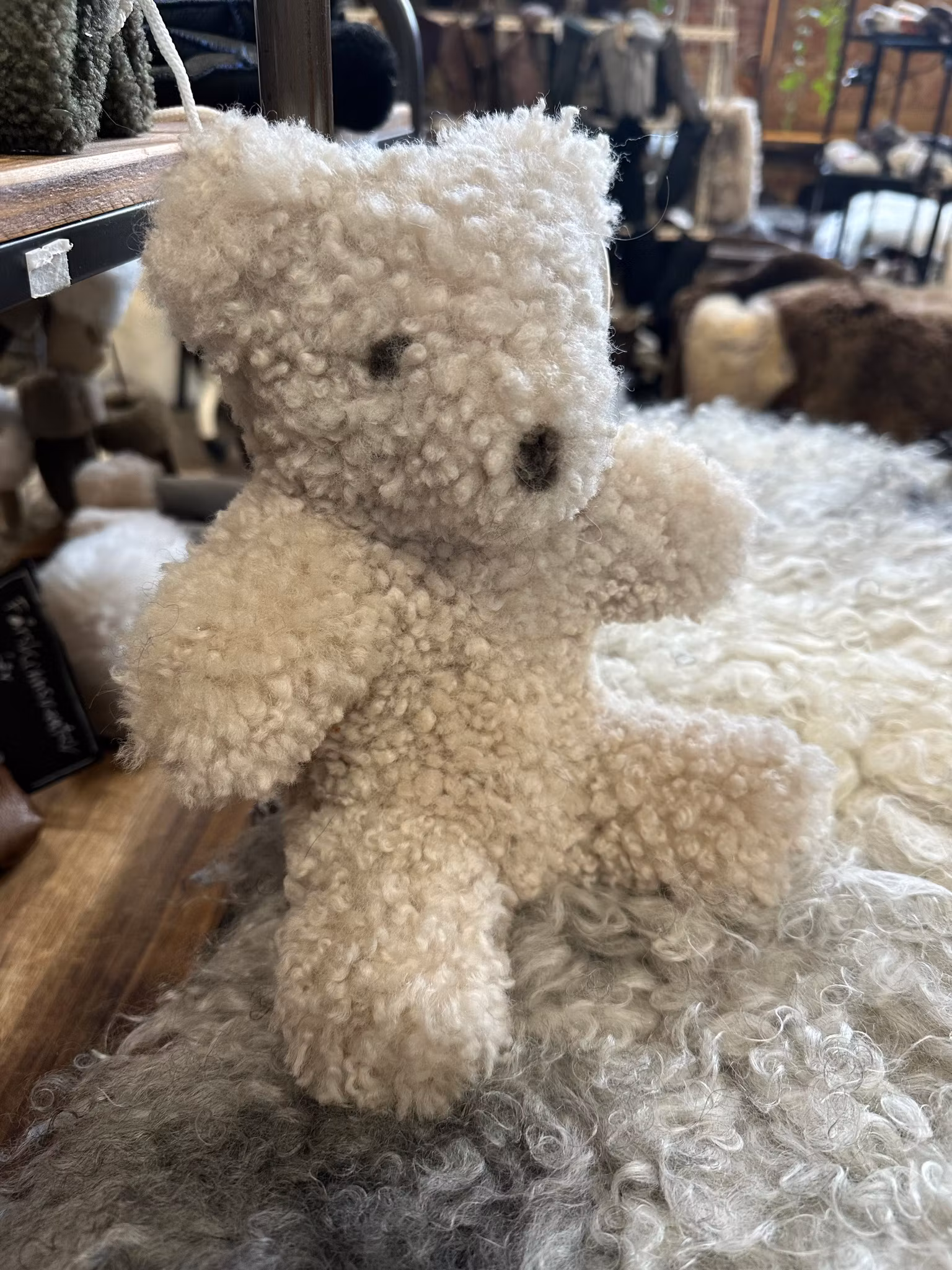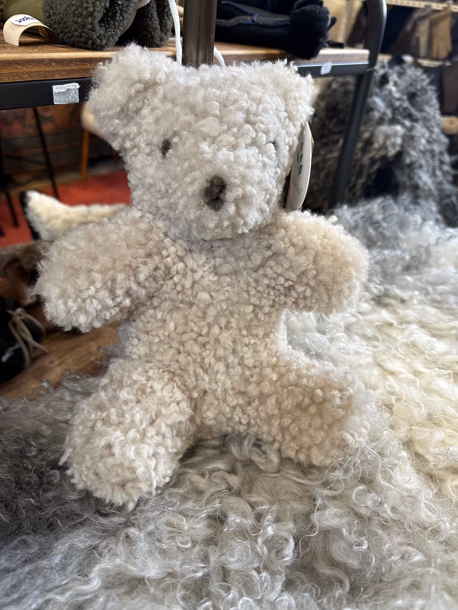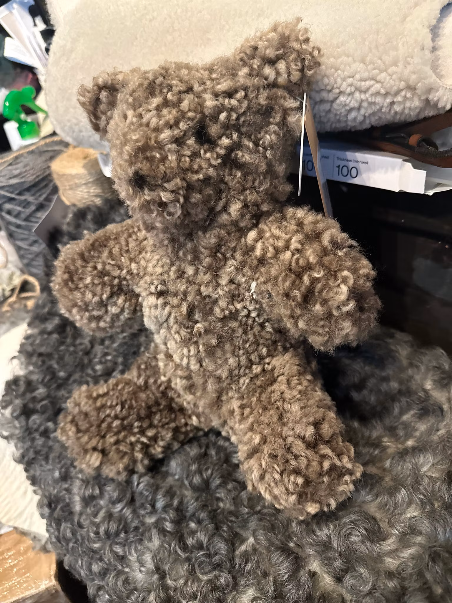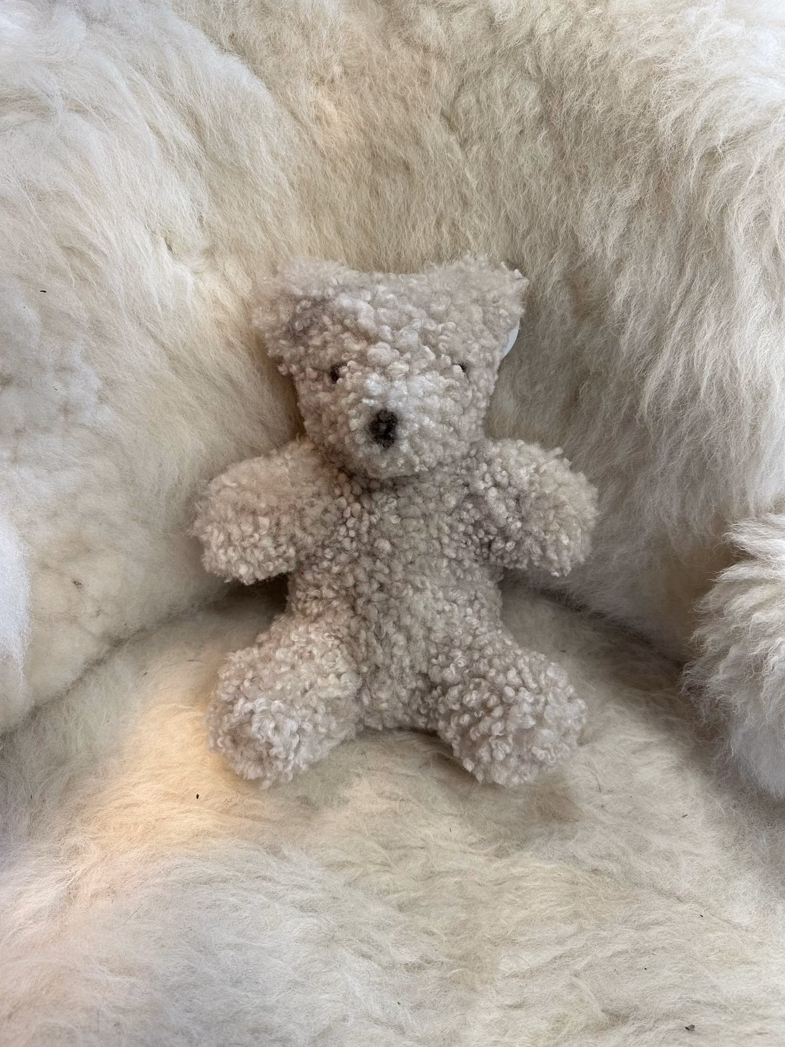 Nallen är tillverkad helt i fårskinn, och även stoppningen består av restmaterial från sömnaden.